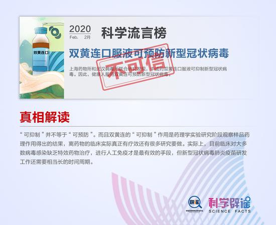 双黄连口服液可预防新型冠状病毒?口罩能水洗还能水煮杀菌?日常清洁消毒液,浓度越高越好?科学辟谣平台与中国互联网联合辟谣平台共同发布2月“科学”流言榜,为你一一揭开真相。