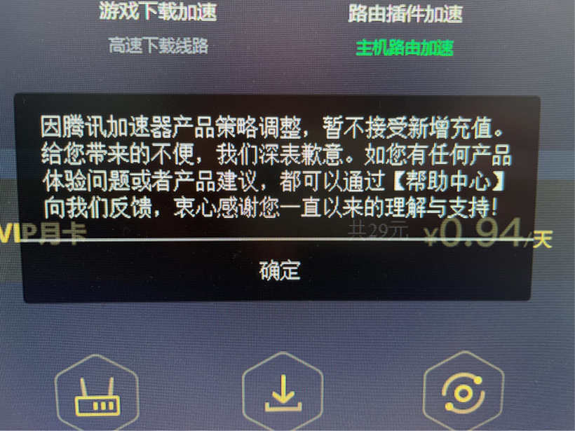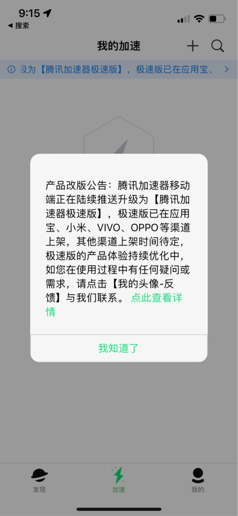 IT之家 12 月 20 日消息,据网友反馈,近期使用腾讯加速器时会弹出相关公告,公告显示,因腾讯加速器产品策略调整,暂不接受新增充值,给用户带来的不便, 腾讯深表歉意。 ![]() 另外还有产品改版公告:腾讯加速器移动端正在陆续推送升级为 [腾讯加速器极速版],极速版已在应用宝、小米、VIVO、OPPO 等渠道上架,其他渠道上架时间待定,极速版的产品体验持续优化中。 ![]() ![]() IT之家获悉,腾讯加速器极速版是腾讯推出的官方加速器,针对王者荣耀、英雄联盟手游、和平精英等手游进行深度网络优化,游戏超强辅助,。支持王者、和平精英、刺激战场、荒野乱斗、龙之谷 2、Switch、绝地求生、传说对决、英雄联盟、云顶之弈、使命召唤、梦幻西游、大话西游、决战平安京、炉石传说等海量国内外游戏的加速。 ![]() |
